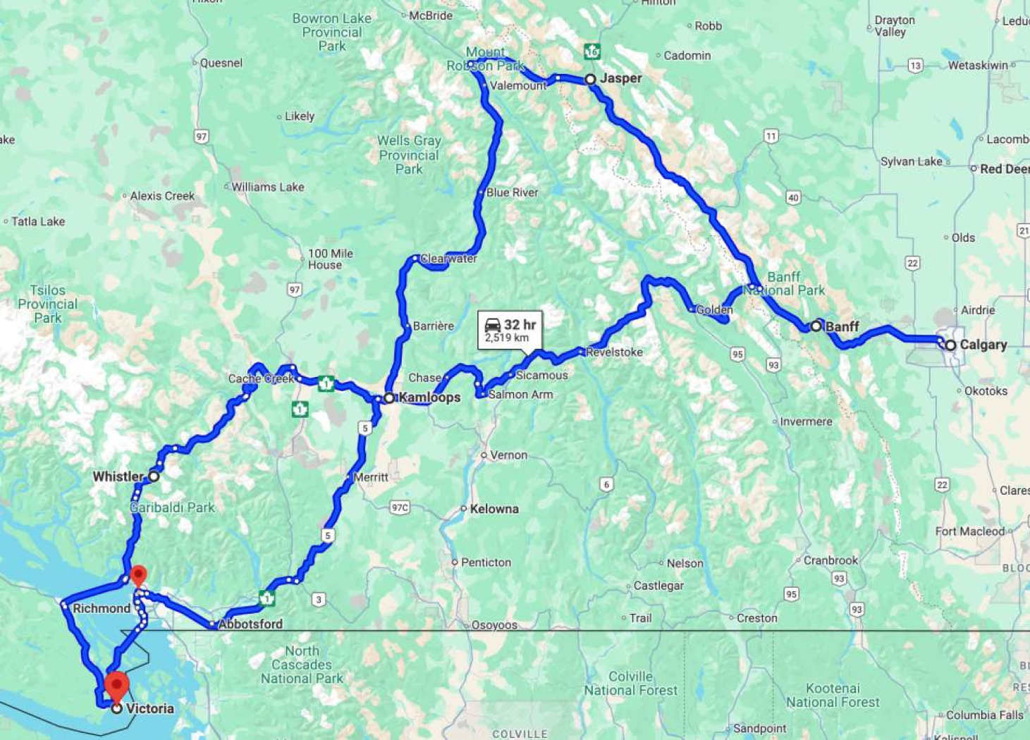 Ванкувер - Вікторія - Вістлер - Камлупс - ПП Веллс-Грей - НП Джаспер - Калгарі - НП Банф - НП Йохо - НП Глейшер - Ревелсток - Камлупс - Ванкувер